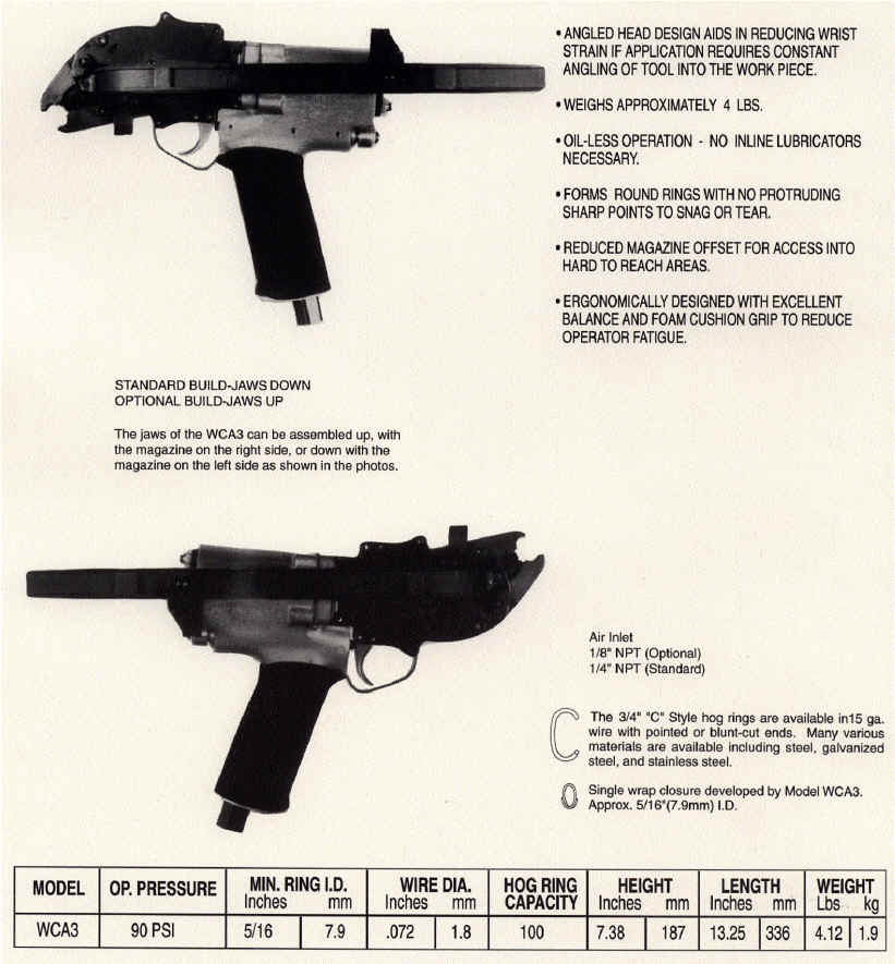The WCA3 is for use in close quarters. The unique angle head allows operation in areas where the WHR Series Hog Ringers are less adaptable.